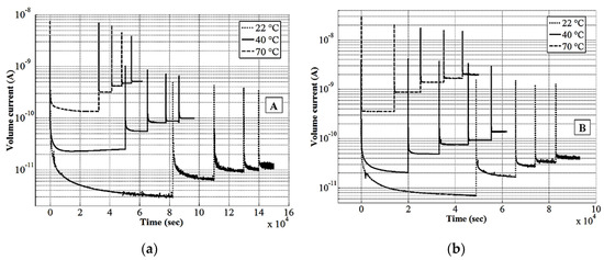 The recorded volume currents are shown in Figure 2. One may notice pronounced spikes of the capacitive currents which appeared at each increase of the test voltage. The amplitudes of these current spikes were higher at higher temperatures as the base level of the current increases. It can be observed that the decaying polarization current is strongly influenced by the material composition, electrical field strength and temperature. Thus, times needed to reach steady volume currents are different for the studied materials. Quantitatively, the relaxation time after applying the first voltage step is almost twice as short for the ATH doped silicone rubber B at room temperature as the relatively pure material A. These can be attributed to the variations in materials compositions and their structural features (a discussion in this regard can be found in [7]). The increase of temperature accelerated the polarization processes in both materials and thus the time to (quasi-) steady state is much shorter at 70 °C than at room temperature. Nevertheless, a decay of the polarization current is noticeable for silicone rubber A, even at the maximum studied temperature of 70 °C. For ATH doped material B, the current decay is much faster under the same conditions. The magnitudes of the steady currents are significantly higher at elevated temperatures.