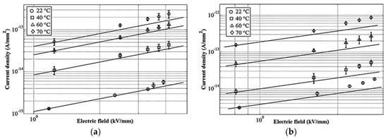 As mentioned in the previous section, combined electrical and thermal stresses may cause injection and space charge accumulation in the material [14,15]. To examine the strength of these effects in the present experiments, the approach outlined in [13] was used and the densities J of the measured currents are plotted as functions of the applied electrical field E in log-log coordinates in Figure 3 (note that the line with the slope equal to unity in such a plot indicates pure Ohmic behavior [16]). As seen, the J(E) characteristics for silicone rubber A, obtained by utilizing the quasi steady-state currents from Figure 2, are close to the line with the unit slope and slight deviations are observed at higher fields and temperatures. For material B, the deviations appear at lower field levels and lower temperatures compared to material A. One should stress, however, that the deviations from Ohmic behavior are fairly weak for both materials, indicating that the threshold fields, above which the injected and accumulated space charges may become significant, were not reached, even at the elevated temperatures. Therefore, the currents recorded in both materials are due to the intrinsic conduction and the respective conductivities can be considered as being close to true material characteristics under the conditions of the present study.