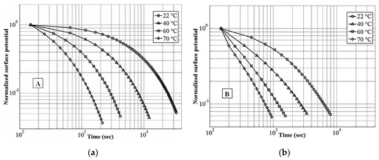 Normalized SPD characteristics obtained at different temperatures are demonstrated in Figure 4. As seen, the temperature strongly accelerates surface potentials decay (note the significant shift of the curves to the left). For silicone rubber A, the time needed for the potential to drop down to the half of its initial value is approximately 5200 s at 22 °C and it is reduced to 1750 s, 700 s and 420 s at temperatures 40 °C, 60 °C and 70 °C, respectively. For material B, the respective times are shorter—approximately 1120 s, 450 s, 290 s and 230 s. Thus, the total reduction due to the temperature rise is about 12 and 5 times for materials A and B, respectively. Based on this observation, one can conclude that the variations of the conductive properties induced by the temperature and the electric field in the bulk (which decreases with time due to the decaying surface potentials) of rubber A are more pronounced than for the material B. At the same time, the decay in material B is faster as compared to material A; this may be due the to the presence of a large amount of ATH filler.