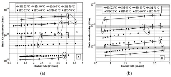 The SPD rates obtained from the numerical differentiation of the measured SPD characteristics and the values of the dielectric constants from Table 1 were used to calculate Kv according to (1). The obtained field dependences Kv (E) for materials A and B at different temperatures are shown in Figure 5, together with the results of the volume current-based measurements. Note that curves indicating data points received from both methods at the same temperature are marked by the encircled areas. As can be observed, the field dependencies of the conductivities of both materials are rather weak in the studied range of the field strength, but the temperature variations are strong and non-linear. In general, the values of Kv vary within two orders of magnitudes for the studied temperature range. Both methods provided results demonstrating the same trends; however, the discrepancies between the obtained conductivity values are different for the studied materials and may be rather high, as can be seen in Table 3. Thus, the volume currents in general yielded a higher conductivity of material A compared to that obtained with the SPD method, except at room temperature, where the opposite behavior is observed and the results are close. At elevated temperatures, the discrepancies are rather stable in the entire studied range of the applied field. For material B, the best agreement was achieved at 40 °C, and the deviations between the results from the two methods are higher at room temperature as well as at higher temperatures, despite the different trends (note different signs at the percentage deviations). A possible cause of such behaviour may be attributed to a thermal expansion of the materials samples at elevated temperatures. Placed between the electrodes in the resistivity test fixture during the current measurement, the sample might experience a constant pressure and, since the studied materials are soft, sample thickness could decrease slightly, due to a thermal expansion causing stronger applied field strength and, respectively, larger volume currents. In contrast, when using the SPD technique, deformations of the samples are avoided.