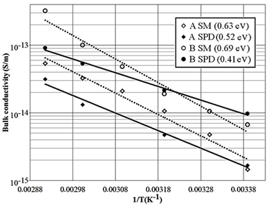 Here, Kv0 is a constant, k is Boltzmann’s constant, Ea stands for the activation energy, and T is the absolute temperature. The results of the fitting of data from Figure 5 by using (2) are shown in Figure 6. One may notice that the dependences Kv (T) obtained by both methods obey Arrhenius law. The activation energies deduced from the standard measurements are slightly higher than those from the SPD technique. Additionally, the difference in Ea for ATH filled material B is larger than for material A. In general, however, the activation energies are close to the values reported earlier for silicone rubbers [18,19].