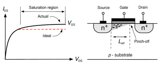 Figure 3 depicts the channel-length modulation phenomenon, in which the drain current IDS of an N-metal-oxide semiconductor (NMOS) transistor is illustrated as an example. When the NMOS drain-source voltage VDS increases, the length of the inverted channel region decreases, leaving a gap of non-inverted silicon called a pinch-off region. In the saturation region, IDS is expressed as [15]: