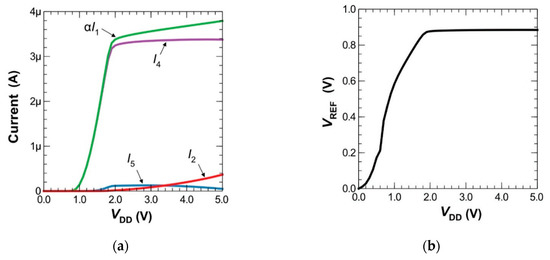 Figure 7 shows the DC response simulation results of the proposed BGR in which the supply voltage varied from 0 to 5 V. The waveforms in Figure 7 corroborate the important currents and voltages in Equations (11) to (15). As expected, αI1 and I2 (both are indicated in Figure 7a) increased with increasing VDD, while I5 behaved conversely to αI1 and I2. As Equation (13) indicates, VLR was the voltage drop across R2 and was the established voltage resulting from the sum of I2 and I5 in R2. By optimizing I2 in VLR, a nearly zero-slope I4 (I4 = αI1-I2-I5) was produced as VDD varied from 2 to 5 V (Figure 7a). The stable current of I4 satisfied the condition stated in Equation (15); as a result, a supply-insensitive VREF was generated (Figure 7b).