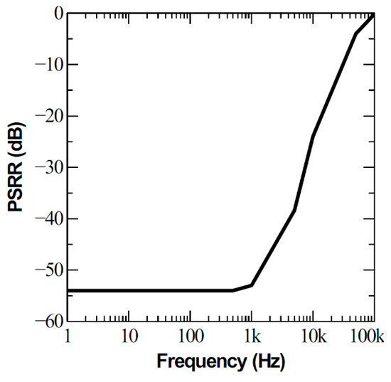 We also measured the power supply rejection ratio of the proposed BGR, where the frequency of a sinusoidal ripple signal swept from 1 Hz to 100 kHz was directly applied to VDD shown in Figure 5 without any off-chip filtering capacitors (Figure 10). This result indicated that the proposed BGR can achieve a maximum PSRR of 54 dB within a frequency band of 1 kHz. The PSRR would be further improved if we add power capacitors to pass the ripple in the supply rail to the ground.