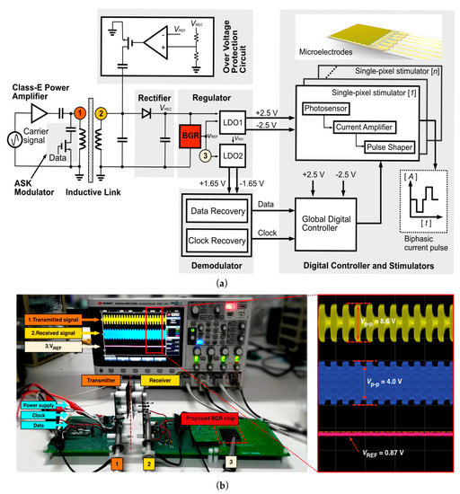 The proposed BGR chip performance was demonstrated using a verification platform of the subretinal implant shown in Figure 11a. The transmitter system is composed of a class-E power amplifier and an amplitude-shift-keying (ASK) modulator circuit that is controlled by a microprocessor unit. The power and data signal are wirelessly delivered to the subretinal prosthesis passing through the inductive link. The receiver architecture consists of a rectifier, a regulator (including the proposed BGR circuit) to generate four different supply voltages of ±1.65 V and ±2.5 V, a demodulator to recover the modulated ASK signal, a digital controller, and a stimulator array. Here, the stimulator works to inject a biphasic current pulse into the bipolar cell inside the eyeball through a microelectrode. The power amplifier transmitted the ASK signal with a data rate of 50 kb/s, peak-to-peak magnitude of 8.6 V, and modulation index of 50%, which was modulated on a power carrier with a clock frequency of 13.56 MHz (zoomed signal in Figure 11b top); the receiver passed through the inductive coils that were placed at the distance of 0.7 cm. The received AC signals (Figure 11b middle) were rectified and fed into the proposed BGR chip. Figure 11b bottom shows a measured VREF of 0.87 V, which was the same as the simulated VREF shown in Figure 7b.