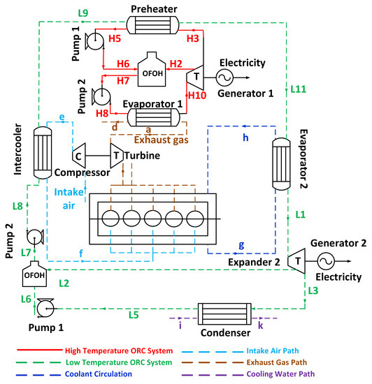 In Figure 1 the schematic view of the regenerative dual-loop ORC with OFOH is shown, which includes the HT and LT loop, and it was considered in the present study. The HT loop has been designed to recover waste heat from the exhaust gases of the diesel engine, whereas the LT loop is used to recover rejected heat from the engine coolant network, the engine intercooler and the condenser of the HT loop, which is used as preheater for the organic fluid of the LT loop.