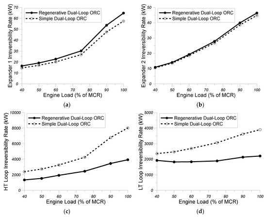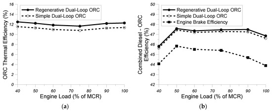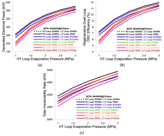 Various technologies have been proposed in the literature for the utilization of waste heat from marine diesel engines [3]. Specifically, Singh and Pedersen [4] have analyzed the specifications and the advantages and disadvantages of a water steam Rankine cycle, a subcritical Rankine cycle, and a supercritical organic Rankine cycle. They have also examined the use of a secondary Kalina cycle with the ammonia–water mixture as working medium as an alternative thermodynamic cycle for the waste heat recovery from marine engines [4]. Singh and Pedersen have also examined the technology of thermoelectric generators for the recovery of waste heat from marine engines and its conversion to useful electric energy [4]. One of the most promising waste heat recovery technologies from marine diesel engines and, in general, from internal combustion engines is Rankine cycle, which comprised of two separate loops: a high temperature (HT) loop and a low temperature (LT) loop, as evidenced from this review paper [4]. In the HT loop a heat exchanger to transfer waste heat from hot exhaust gases to a wet or a dry working medium is used, which then expands in the HT loop expander. “Wet” is defined the working medium that expands inside the two-phase area, whereas as “dry” is defined as the working medium that its expansion leads to the superheated area [4]. A characteristic “wet” working medium is the water steam, which expands inside the two-phase area due to the shape of the saturation curve, whereas many organic working mediums are characterized as “dry” ones, since the sloped saturation curve force them to expand inside the superheated region [4]. In the LT loop, the recovery of lower grade waste heat as compared to exhaust gases is conducted from engine coolant and from the cooling medium of the intercooler and generation of additional power in the LT loop expander. Liu et al. [5] investigated the thermodynamic performance of various organic Rankine cycle (ORC) configurations and compared them with a theoretical optimum reversible Rankine cycle in order to determine the optimum practical Rankine cycle between the high and the low temperature heat sink. Liu et al. [5] also thermodynamically investigated the following organic Rankine cycle configurations: basic ORC, supercritical ORC, regenerative ORC, split regenerative ORC, cascade ORC, and two-pressure stage ORC. They found from this comparison that the two-pressure stage ORC indicated the highest relative efficiency when compared to the theoretical reversible ORC between the two heat sinks. For this reason, various configurations of dual-loop ORCs have been used in many applications of internal combustion engines. Specifically, Andreasen et al. [6] performed a comparative analysis of a dual-loop Rankine cycle with water steam with a pertinent ORC in order to recover waste heat from a main diesel engine of a container ship. These results showed that the net generated power of the steam Rankine cycle is higher when compared to the corresponding one of the ORC at high engine loads whereas, at low engine loads the operational performance of the organic Rankine cycle is superior as compared to the corresponding one of the steam Rankine cycle [6].