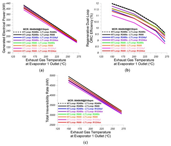 Li et al. [7] proposed the use of a two-stage ORC for the exhaust gas heat recovery in a HT loop with expander and regenerator and a LT loop with second expander. Five organic mediums were examined in this study [7] and, specifically, toluene, benzene, cyclohexane, and R245fa for the generation of additional power in the two expanders of the dual-loop organic cycle, which was coupled to a diesel engine with 13 L capacity. The assessment of the results of this study [7] have showed that, as the effectiveness of the regenerator is increased, the thermal cycle efficiency and the net generated power are increased, since, in this case, exhaust gas temperature at the exit of the evaporator is increased.