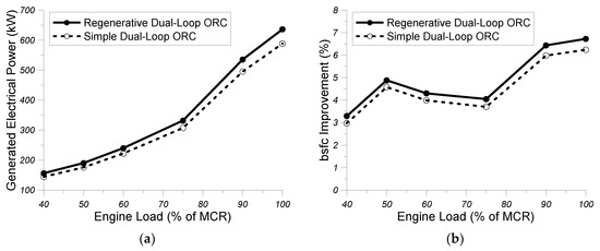 Sung and Kim [13] designed a new system of dual-loop ORC for a dual-fuel (natural gas/diesel) marine compression ignition (CI) engine. The organic medium in the HT loop of the ORC recovers waste heat from the exhaust gases, whereas the organic fluid in the LT loop recovers waste heat from the engine coolant and from the cold side of the liquefied natural gas (LNG) [13]. The optimization of the system showed that the preheater and the evaporator with normal pentane and R125 as working mediums resulted in an increase of the maximum generated work by 5.17% when compared to the initially generated work of the dual-fuel CI engine [13].