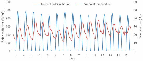 Variation of the incident solar radiation and ambient temperature.