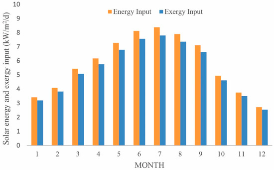The monthly average energy and exergy inputs are shown in Figure 3. The energy and exergy distributions have similar trends and vary between 2.72–8.38 kW/m2 and 2.54–7.8 kW/m2, respectively.