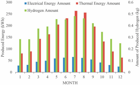 Monthly distribution of electrical-thermal energy and produced hydrogen amounts.
