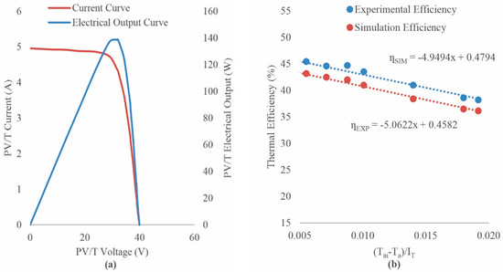 The experimental PV/T array current-voltage (I-V) and power-voltage (P-V) characteristic for 950 W/m2 solar radiation and 33 °C ambient temperature is presented in Figure 5a. The short circuit current of the array and the open-circuit voltage were measured as 4.96 A and 39.9 V under these conditions, respectively. Hence, the maximum electrical output of the array was calculated as 139 W with 32 V. The characteristic experimental thermal efficiency depending on (Tin − Ta)/IT was calculated on a daily basis and compared with the simulation data under the same climatic conditions (Figure 5b). The optical efficiency of the experimental system was obtained as 45.8%, and it was 47.9% for the simulation system.
