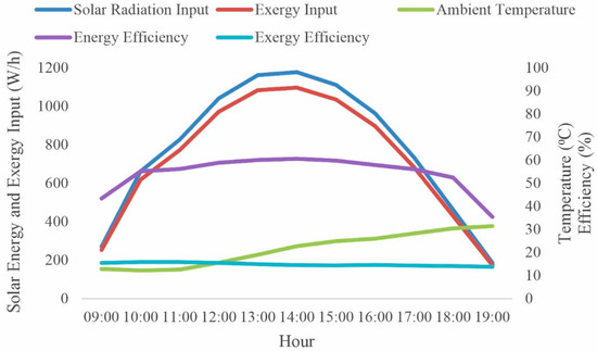 The hourly variation in the energy–exergy efficiency of the PV/T, energy–exergy input and ambient temperature on a daily basis.