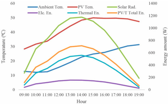 The variations of the hourly electrical, thermal and total PV/T energy amounts depending on ambient temperature and inclined radiation on a daily basis are shown in Figure 7. While inclined radiation and ambient data varied in the respective ranges of 153–963 W/m2 and 12.8–31.4 °C, the PV temperature changed between 26.3 °C and 50 °C, and the produced electrical, thermal and total energy amounts were calculated as varying in the ranges of 24.75–156.4 Wh, 41.5–558.7 Wh, and 66.25–713.6 Wh, respectively. The results showed that the increase in PV cell temperature led to a decrease in both PV efficiency and electrical output of the system.
