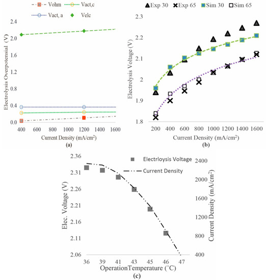 where the F is the Faraday constant and z is the number of electrons transferred. The voltage of the electrolyzer (Velc) can be calculated as follows: