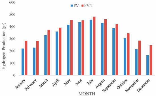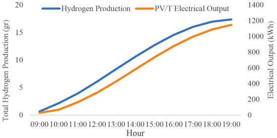 Oruc et al. conducted finite-element analysis simulations for a PV/T E system in order to maximize overall energetic efficiency and hydrogen production, and consequently the change of energy efficiency of the system was calculated in the range of 56–59% [52]. In addition, the performance of an integrated PV/T system for hydrogen production and cooling was analyzed by Ratlamwala et al. The impact of solar intensity, PV electrical output, electrolysis operating time, production of hydrogen and coefficient of performance (COP) were evaluated energetically and exergetically. The highest hydrogen production of the system was 9.7 kg and maximum energy and exergy efficiencies were 15.6% and 7.9%, respectively [53].