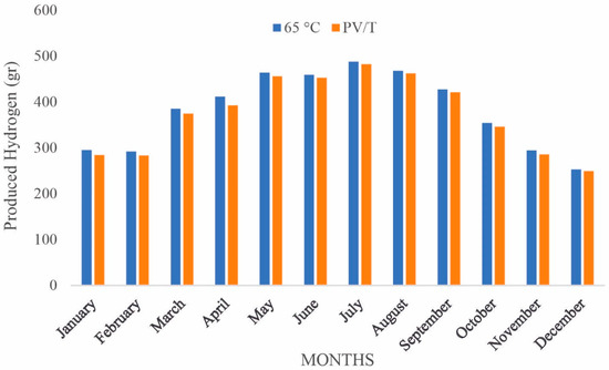 The annual amount of electrical, thermal, and hydrogen production by the PV/T-E hybrid system in Balikesir were calculated with the numerical model and the results were 556.8 kWh, 1912 kWh and 4.491 kg/year, respectively. The monthly amount of the electrical and thermal energy and produced hydrogen are given in Figure 4.