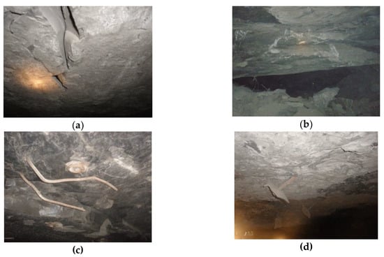 Geomechanical and technological shocks occurring in copper ore mines are one of the most important problems related to the loss of excavation stability [34,35]. Additional dynamic loads negatively affect not only the functionality of the room excavation, but also the condition of the rock bolts. Based on mine observations, it was found that the largest changes occur in the case of very stratified or irregularly built roofs. In most cases, there are no visible changes in the roof and bolt support after the shocks occur. The effects of roof destruction appear relatively rarely and usually are visible only after a certain period of time. The impact of rock mass shocks on the excavation condition is manifested in the form of: falling off rock lumps from the side walls of excavations (local dynamic rock outbursts from the side walls of the excavation); falling of rocks around bearing plates; falling out of small rock fragments between the bolts, causing the process of further destruction of the roof; the formation of fissures between bolted layers; breaks (fissures) in the roof layers (Figure 1a); local roof falls of the roof layers about 2 m high (Figure 1b); lifting the floor of the room. However, the impact of rock mass tremors on the rock bolt support is manifested in the form of: breaking of the bolt when the roof rocks fall, only a few dozen centimeters thick, whose weight per bolt is disproportionately small compared to its carrying capacity (Figure 1c); a decrease in the pre-tension of the expansion bolts from 30% to 50% and the sliding of the bolts from the hole (Figure 1d).