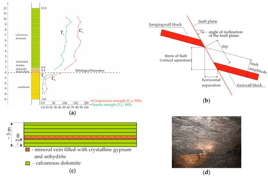 Geological factors affecting on the stability of a room excavation: (a) Variability of rock compressive and tensile strength; (b) Fault parameters; (c) Stratification of roof layers; (d) Stratification roof with visible horizontal white layers of gypsum and anhydrite.