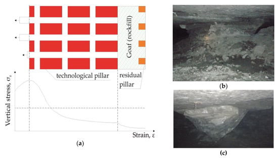 The basic condition for safe and economical exploitation of deposits is proper management of the roof, including determining its full carrying capacity. Due to the way the roof is managed in the LOGM underground mines, there are methods with roof deflection and automatic caving as well as methods with roof protection (hydraulic backfilling and rock fill).The use of room and pillar method with roof deflection consists in cutting the deposit with the arrangement of rooms and leaving inter-room pillars of such dimensions that on the front of the works leads to the destruction of the structure of the pillars and their work in a post-failure state (Figure 3a). This is particularly important in rock burst hazard conditions, as the rock mass in the post-failure state has very little capacity to accumulate elastic energy. That is why proper selection of shape and technological dimensions is a fundamental technological method for combating rock bursts. The pillars work on post-failure (decreasing) stress-strain characteristics, characterized by high yieldable and allow the roof to deflect. A stratified and relaxed rock block breaks off the roof over the entire mining field, which loads the technological pillars [35]. The final phase in the field of exploitation is the cutting of inter-room pillars (Figure 3b) to the minimal dimensions (Figure 3c). This process is followed by a roof caving in the depths of the goaf.