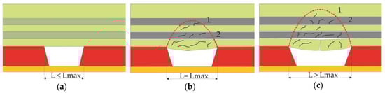 Behaviour of the room excavation roof as a result of moving the mining front: (a) Direct roof in the bed cutting phase; (b) Fissured and bending roof beam; (c) Formation of a three-hinged arch; L—room width; Lmax—maximal room width; 1—pressure vault; 2—relief stress zone.