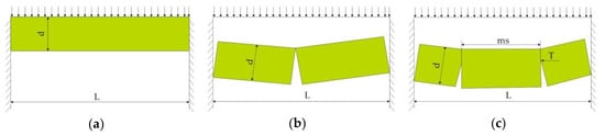 Safety factors for roof layers: (a) Continuous; (b) Two-span discontinuous; (c) Three-span discontinuous; d—layer thickness, L—layer span; ms—length of the middle block; T—axial force.