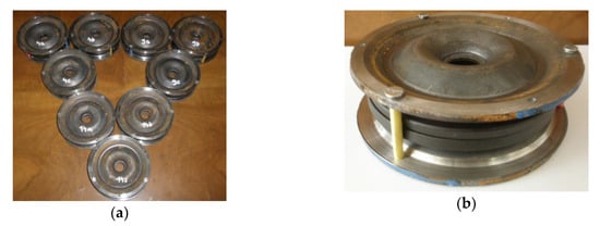 The tests were carried out in the bolting laboratory of the Department of Mining Engineering and Work Safety at the AGH University of Science and Technology in Krakow. Mechanical load sensors for the rock bolt support have been designed and manufactured in laboratory conditions (Figure 6a). The sensor consists of two profiled bearing plates, two disk springs, three mounting screws and three holes in the bearing plate (Figure 6b).