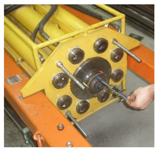 - Fall of measuring cylinders from a dynamometric bearing plate, which consists of two cylinders that move relative to each other due to the effect of compressive load. The thickness of each measuring ring is selected according to the load-deformation characteristics of the elastic element. After sliding and falling off individual measuring rings of known thickness, their number is visually determined and the values of axial force loading the bolt are determined indirectly [27,28].