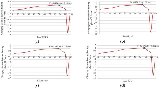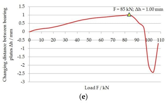 Simultaneously with the measurement of the mechanical deformation of the force sensor, load measurements of the entire bolt support were carried out. Four strain gauges force sensors were used for the measurement, which were connected to the measuring amplifier type QAUNTUM MX840A (HBM, Spectris plc, Darmstadt, Germany). The measurement results were monitored on an ongoing basis in the CatmanEasy software (HBM, Spectris plc, Darmstadt, Germany). The tests were carried out under static load. The load rate was 0.5 kN/s. The tests assumed a hold time of 120 s, which was used to read the measurements from the caliper. Each time after a 10 kN load increase, the hold time followed. Rock bolts equipped with force sensors have been tested five times. The results of sensor calibration measurements are presented in Figure 9a–e.