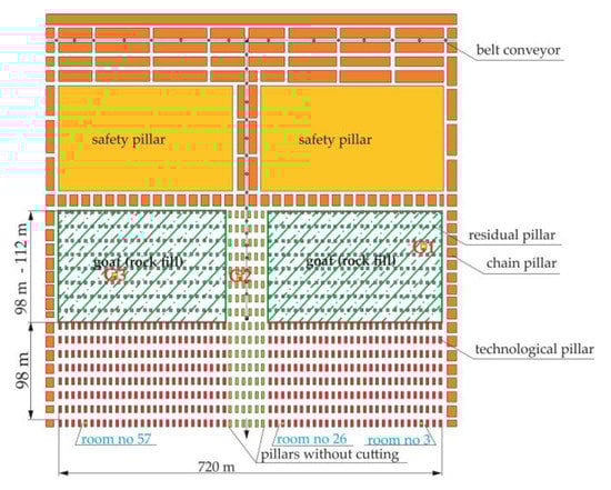 Industrial tests were carried out in the underground copper ore mine “Polkowice Sieroszowice”, belonging to KGHM Polish Copper S.A. in the LGOM area. Exploration field B was selected for testing, where mining was carried out at a depth of 809–820 m below the ground surface, with a room-pillar method with roof deflection and maintaining the central part of the mining field. The research focused on measuring the load of the expansion rock bolt support, vertical convergence and determining the increase in vertical stress. Three rooms, numbers 3, 26 and 57, in which tests were performed twice a week for two months were selected to assess the behaviour of the room excavation during progressing operation (Figure 10). In exploitation field B, the width of the pillar along the strike was 6 m and length 8 m. On the other hand, the width of the room at the roof was 6 m, and at the bottom 5 m. The height of excavations in the cutting phase depended on the thickness of the exploited deposit and the operating requirements of working self-propelled machines and was up to 4.5 m. The room height ranged from 1.8 m to 2.6 m. The minimal opening size of the mining front was equal to the sum of the width of two strips and the length of two rows of pillars, as well as the section with rooms into the ore face. The maximal width of the front opening was 112 m. The width of the maintaining the central part of the mining field included six pillars (Figure 10). As the exploitation front progresses, the technological pillars from the last row before the goafs were taken, cut into smaller ones, depending on the degree of their disintegration. Supporting pillars were taken to residual dimensions with a minimal area of 7.4 m2, and then left in goafs, where they fulfilled the role of supports yielding the curvature of the bending floor layers. The space between the residual pillars was filled with the use of rock fill, obtained from mining of ore deposits.