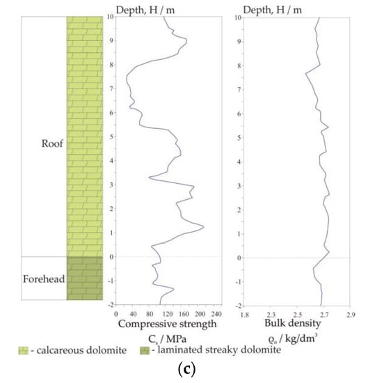 Geotechnical profiles of the deposit in mining field B: (a) Drillhole G1; (b) Drillhole G2; (c) Drillhole G3.