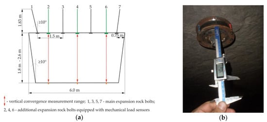 In selected exploitation rooms: 3, 26 and 57, an additional three expansion rock bolts with new mechanical force sensors were installed in the excavation roof (Figure 12a). In the industrial tests, the same bolt support as in laboratory tests were used. The additional bolt support was 1830 mm long and was installed in the hole by means of a 36 mm expansion head. In the roof of the room excavations holes with a diameter 38 mm were drilled. In each room, three sensors were installed. The load on the bolt support was determined indirectly by measuring the appropriate distances of the sensor reference points using an electronic caliper with a reading accuracy of up to 0.01 mm (Figure 12b). This measurement was carried out through three holes in the force sensor bearing plate (Figure 6b). Then, using calibration curves (Figure 9a–e), axial force values were determined. Simultaneously with the measurement of the load on the bolt support, vertical convergence was measured (Figure 13). In the test a laser rangefinder, which had a measurement accuracy of up to 1 mm and a range of up to 80 m was used. As the base of measurement, the end of the bolt rod in the roof and the benchmarks built in the bottom of the excavation, between which the measurement was taken, was adopted (Figure 12a). In each of the test rooms: 3, 26 and 57) three measurements were taken, twice a week. The test was conducted over a period of two months. The results of measurements of the rock bolt support load as a function of distance from the operational face and vertical convergence are presented in Figure 14a–c.