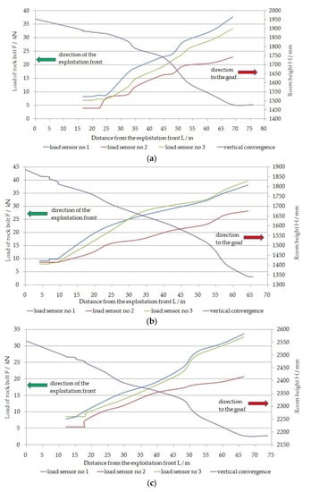 Load of rock bolts and convergence in the exploitation room: (a) Room number 3; (b) Room number 26; (c) Room number 57.