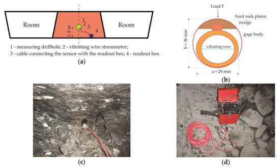 Measurement of stress increase in the inter-room pillar: (a) Scheme of sensor location in the pillar; (b) A 4300EX sensor placed into the pillar; (c) Dimensions of the sensor; (d) GK-403 readout box.