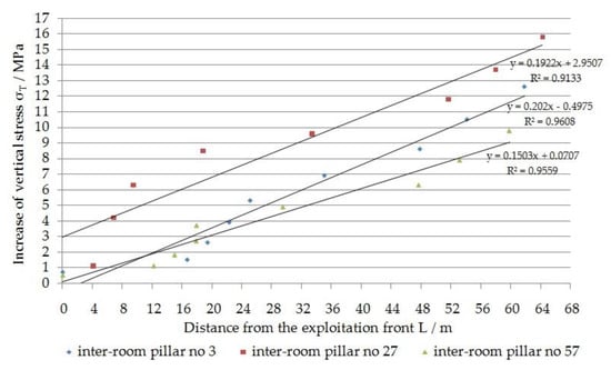 The maximal increase in vertical stress in the inter-pillar (σT = 15.8 MPa) occurred in the central part of the mining field, i.e., between rooms 25 and 26; 64 m from the mining face. Then the convergence was 545 mm, with the maximal load of the rock bolt. For the two boundary rooms of the mining field, i.e., room number 3 and room number 57, the maximal values of vertical stress increase were 12.6 MPa and 9.8 MPa, respectively. Then the convergence for rooms: 3 and 57 was 475 mm and 370 mm, respectively, at the maximal load of the rock bolt. For the two-month period, the average weekly increase in vertical stress for rooms: 3, 26 and 57 was 1.47 MPa/week; 1.84 MPa/week; 1.14 MPa/week, respectively. The average weekly increase in vertical stress in the middle of the field is greater by 20.11% and 38.04%, respectively, compared to the boundary rooms: 3 and 57.