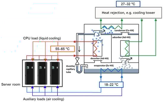 An adsorption chiller (Figure 1) consists of two adsorption heat exchangers, a condenser, and an evaporator, in a pure working fluid atmosphere. If temperatures below 0 °C can be excluded, usually water is used as working fluid, due to its high evaporation enthalpy. The adsorption heat exchangers (Ad-HX) have a heat transfer fluid on the primary and a stationary adsorbent material or composite on the secondary side. The process is cyclic: In the first half-cycle, the CPU’s waste heat is used to regenerate the first Ad-HX. The desorbed working fluid is condensed in the condenser which is cooled to the ambient at, e.g., 30 °C. In the second half-cycle, working fluid is adsorbed on the Ad-HX which, again, is cooled to the ambient. The resulting pressure drop induces the evaporation in the evaporator at about 20 °C, which is used to supply the air cooling of the server rooms. For continuous provision of cooling, two Ad-HXs are operated alternately. In contrast to typical thermally driven cooling applications, the coefficient of performance (COP) of this cycle is determined by the ratio of CPU and auxiliary heat loads and in the order of 0.5–0.6 [6].