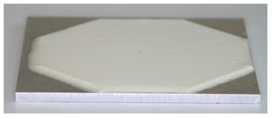 An aqueous dispersion (26.8 wt% aluminium fumarate (a.k.a. MIL-53(Al)-FA), Basolite® A520, BASF; 17.9 wt% SilRes® MP50E, Wacker Silicones) was processed by a knife coating applicator on 50 × 50 × 2 mm AlMg3 sample plates (Table 1). The wet film thickness was varied by an octagonal stainless-steel mask with a defined thickness (200 µm, 350 µm, 600 µm) and constant coating surface (18.7 cm2). Samples were oven dried at 200 °C for 3 h before measuring coating thicknesses of final samples (Table 1, Figure 2) at five points with a probe indicator. The composite dry mass was determined by quickly (T ≥ 160 °C) weighing the hot samples under lab atmosphere after oven drying. Total dry adsorbent content was first calculated from the suspension composition, based on experimentally determined dry masses of different components, as shown by Kummer et al. [23], and later cross checked by comparing the samples’ uptake to the uptake of pure adsorbent powder measured volumetrically (AUTOSORB®, Quantachrome).