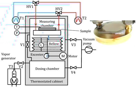 The volume of the dosing chamber is constant ( 41.815 ± 0.021 L), while the measurement chamber volume ( 885.4 ± 1.3 mL) can be varied by 4.12% through a mechanically driven vacuum bellow, while the bellow position is recorded with a vacuum stable linear variable differential transformer (LVDT, Schreiber Messtechnik). The bellow position has been calibrated with a second order polynomial to the chamber volume by filling the evacuated and temperature-controlled chamber with water of known mass. The sample is thermally well connected (thermal grease TG20032) to the cold plate kept isothermal (±0.01 K) by two switchable external circuits. The cold plate temperature is precisely measured with a 4-wired Pt100 sensor embedded in a bore. The chamber pressure is measured with a capacitive pressure transducer (MKS Baratron 627B, 0–100 mbar). Additionally, the sample’s surface temperature is recorded using an IR temperature sensor (Heitronics KT15) through a ZnSe vacuum viewport with a noise equivalent temperature difference of 25 mK at a response time of 1 s. The measurement spot has a diameter of 6 mm (95%) and the detector’s spectral response maximum is between 8 and 14 µm, fitting to the transmissivity of the ZnSe viewport and the aimed sample temperature (20–80 °C). To minimise temperature gradients, the whole vacuum setup is encapsulated in a temperature-controlled cabinet (±0.01 K) set to the mean cold plate temperature. Data acquisition is performed with a high precision digital multimeter (Agilent 34970A).
