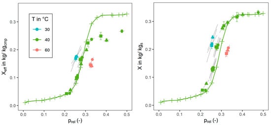 The uncertainty of the mean values are between 0.4 mL (20 °C) and 1.3 mL (80 °C) for , between 0.05 mbar ( 5 mbar) and 0.15 mbar ( 100 mbar) for the chamber pressure, and about 0.1 K for the mean sample temperature . Typical uncertainties for vapour dosing are in the order of 1 to 4 mg influenced mainly by for 10 to 60 mbar. Thus, uncertainties for the loading are smaller for higher sample dry mass, given constant dry mass uncertainty.