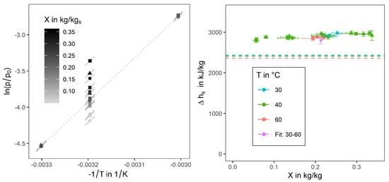 Left: Clausius–Clapeyron plot ( 1 bar) with measured equilibrium points for different samples (▲ Ct_140, ■ Ct_240, ● Ct_610) and isostere slope calculated from measured local deviations (short grey lines) and linear fit of points with 0.16 kg/kg (- - -), uncertainties of and are bellow point size; Right: differential adsorption enthalpy calculated from isostere slopes of local equilibria and 0.2-kg/kg-fit over corrected loading with the evaporation enthalpy of water (- - -).