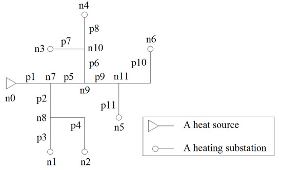 An example branch DHN contains 12 nodes (including one reference node, n0) and 11 pipes. The topology of the DHN is shown in Figure 1.