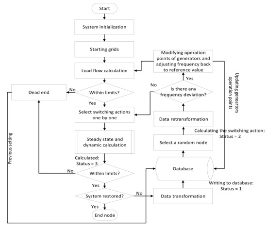 The flow chart in Figure 1 represents an automated restoration algorithm, including both the load flow calculation and evaluation of the system’s dynamic behavior. The MATLAB code executes one possible switching action after the other and calculates each new network state.