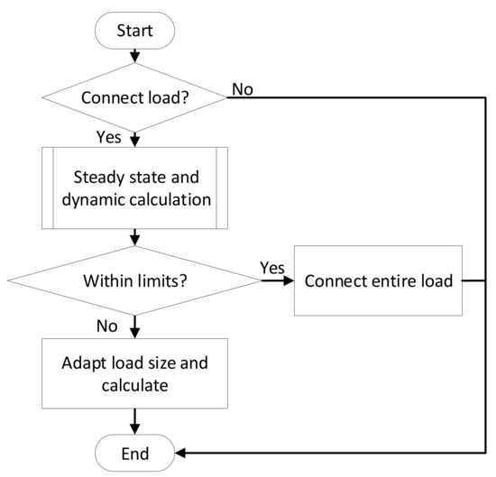 To ensure a secure restoration, the network is re-energized step by step. The algorithm depicted in Figure 2 calculates what part of a lumped load in each step can be re-connected. If the connection of the entire load exceeds the security constraints, only a chunk of the load with a predefined granularity (e.g., in 10% steps) is connected to maintain the previously exceeded parameter within the allowable range.