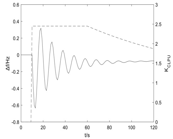 The CLPU behavior considered in the simulations and dynamic frequency characteristic of a load re-connection are depicted in Figure 3 with the following equations, where is the steady state load: