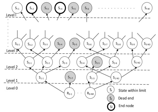 Network restoration processes are modeled as a very large tree-like directed acyclic graph [16]. The graph presented in Figure 4 demonstrates the network restoration tree. The root of the tree is the starting point ϱ ∈ {R0-1, R0-2, …, R0-NR}, where zero defines the root level and NR defines the number of starting points in the network. Each starting point may have a different configuration depending on the chosen restoration strategy. Each node is designated as Sl-j, where l is the so-called level, i.e., the number of switching actions, which have been performed to reach it, and j an index for the nodes of each level, going from 1 to Nj. In Figure 4, each node in the network except the root nodes originates from its parent node, which in turn has a set of the children nodes. The states in the tree are connected by edges that are representing switching actions. The incoming edge connects a specific node to its parent node and outgoing edges connect a specific node to its children nodes [22].