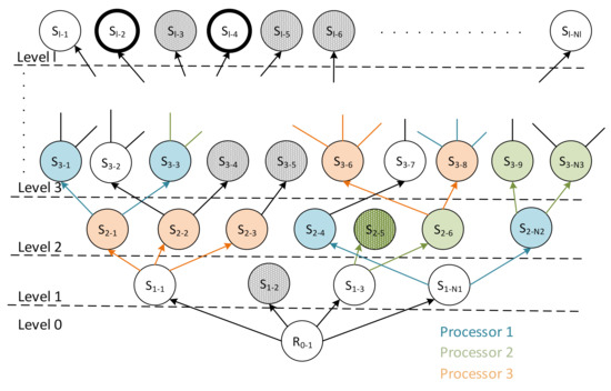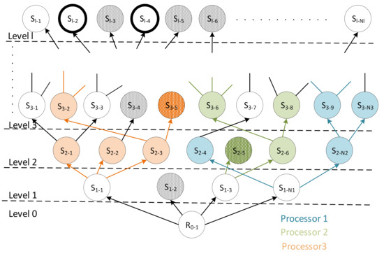 Figure 6 shows the parallel oDFS strategy. As can be seen, one processor starts the calculation first and after a certain delay, other processors start to select available unexplored nodes from the lowest level. Therefore, paths can be created in parallel based on the initial nodes selected by the processors.