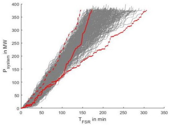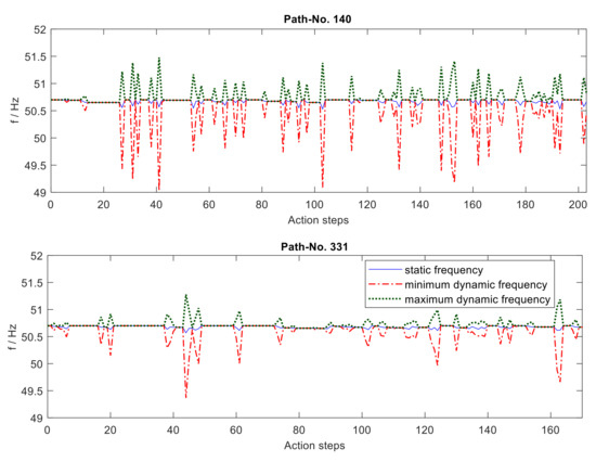 Figure 9 presents the minimum and maximum dynamic and the static frequency observed on Path-No. 140 (Table S140) and Path-No. 331( Table S331) The maximum frequency limit is 51.5 Hz and the minimum frequency limit is 49 Hz. The system load step ability is more critical in the beginning of the restoration. Moreover, in the beginning of the restoration, the dynamic frequency deviation is higher than in the later phase. As depicted, the fastest simulated path—Path-No. 140—is close to the security limits but always above 49 Hz in comparison to the reference path.