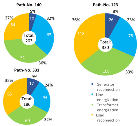 The pie charts in Figure 8 compare the share of reconnected elements at the end of the rebuilding process for the selected paths (Table S332). In Path-No. 140, the number of reconnected loads is lower than in other paths, which means that loads are connected in larger steps. Besides, the low amount of re-synchronized generators leads to higher frequency deviations. However, the share of transformer and the power line energizations is higher. Path-No. 331 illustrates a dynamically stably restored system with a high contribution of re-synchronized generators and re-connected loads. Path-No. 123 represents the path with the greatest number of switching actions, leading to a longer restoration time. In Figure 8, the number of activated generators excludes the number of initial BSU.