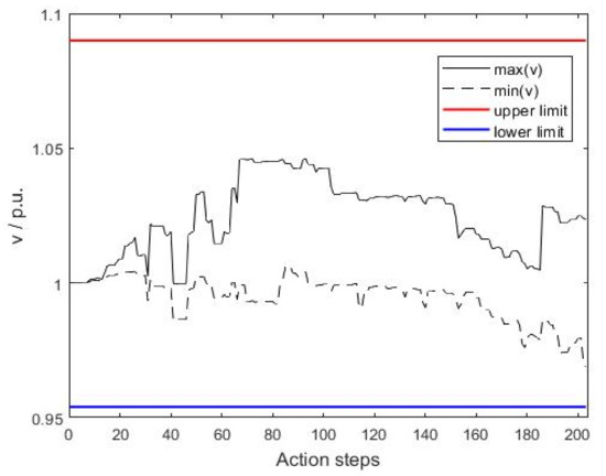 Figure 10 shows the maximum and minimum voltage observed on any of the 158 busses in the network after each action step in Path-No. 140. The voltage upper limit is 1.09 p.u. and the lower limit is 0.954 p.u. As depicted, it can be seen in the later action steps, the minimum voltage observed is close to but still above 0.954 p.u. This indicates that in the later stage of a system restoration, possible switching actions may be limited due to the defined voltage limits. This situation can be improved by reactive power management which is not modelled in the current automated algorithm described in this paper.